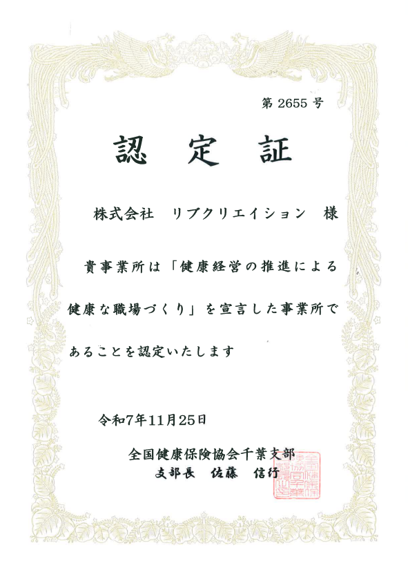 2025年11月25日、全国健康保険協会千葉支部より、『健康経営の推進による健康な職場づくり』を宣言した事業者として正式に認定されました。