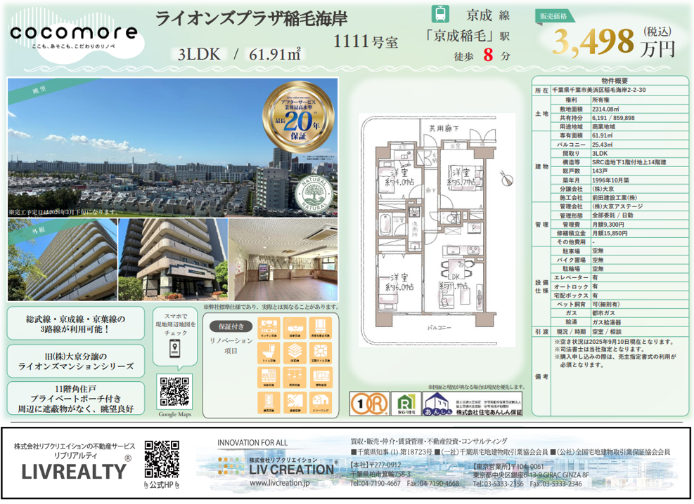 (新着!)ライオンズプラザ稲毛海岸1111号室 3,498万円
